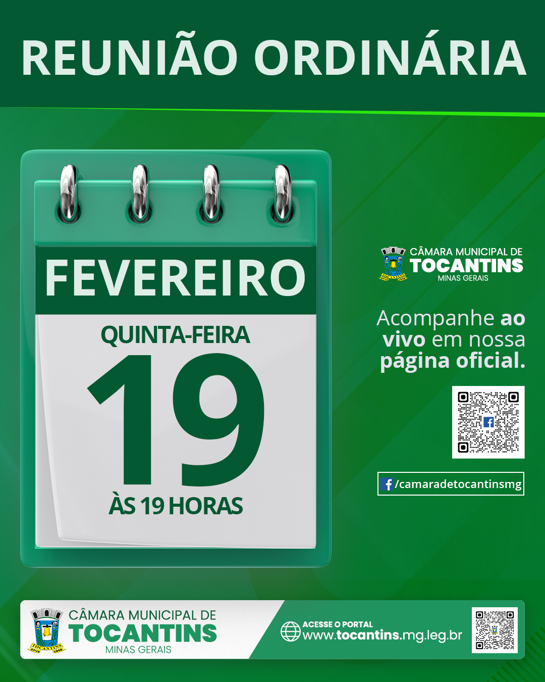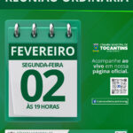 Acompanhe a Reunião Ordinária da Câmara Municipal de Tocantins nesta quinta-feira, 19 de fevereiro de 2026, às 19h, com transmissão ao vivo pela nossa página oficial no Facebook.